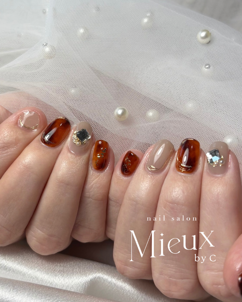 左右1本づつある大ぶりのビジューがキラッキラでめちゃくちゃかわいいです😍べっ甲とゴールドで大人なネイルに仕上がりました✨️こらちらは定額サンプルよりご利用頂けます🙂↕️これから春になりお花やパステルカラーのカラフルなサンプルを作りないなぁと考えているところです🥳できましたらまたブログやSNSでご紹介させて頂きますね🙌本日もご覧いただきありがとうございました🙂↕️